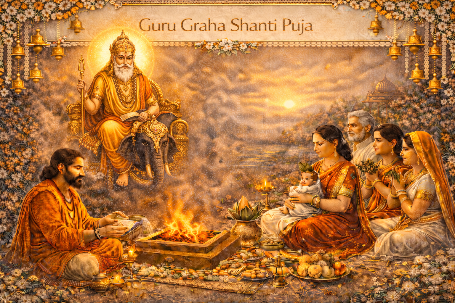 Guru Graha Shanti Puja strengthens Jupiter’s blessings for wisdom and discipline.